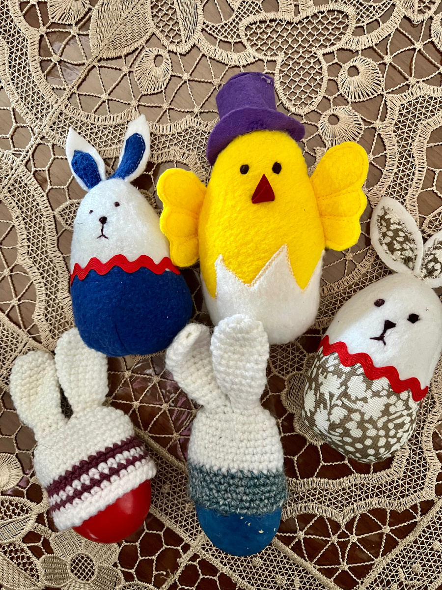 Пасхальные зайцы! Не знаю почему зайцы, и причем зайцы и яйца крашеные на Пасху 🤷♀️🤷♀️🤷♀️, но это красиво! Я тут уборку делала, и нашла зайчиков мною сшитых их флиса! Только сшила я их только 2 штуки, хотела побольше, но толи времени не хватило, толи что-то другое отвлекло! Среди моих Зайцев затесался цыплёнок джентельмен 😃👍 И вот такие ушки я тоже связала 😃 Но зато в интернете столько идей , что сразу захотелось что-то эдакое связать! Но меня останавливает отсутствие пряжи, я имею ввиду свои хомячьи запасы! Нету у меня хлопковых ниток 🤷♀️😩😩Вот как доберусь до магазина, закуплюсь и кааак начну вязать, если только какая-нибудь работа другая не появится. Вообще то сейчас у меня заказ на юбку, и поскольку ткань демисезонная, то нужно сшить сейчас, а скоро будет очень жарко. А пока полюбуемся зайчиками , есть и простые работы ввиде подставок для чашек и посложнее. Не знаю кто как , а я люблю подставки, может потому, что столик стеклянный🤔 Эти подставки из текстильной