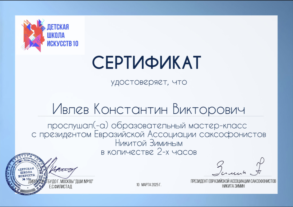 СЕРТИФИКАТ удостоверяет, что Ивлев Константин Викторович прослушал(-а) образовательный мастер-класс с президентом Евразийской Ассоциации саксофонистов Никитой Зиминым в количестве 2-х часов.