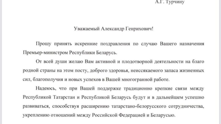Раис Республики Татарстан Рустам Минниханов направил поздравление премьер-министру Республики Беларусь Александру Турчину. Соответствующая телеграмма появилась на сайте пресс-службы раиса РТ. Вчера в Белоруссии был подписан указ о назначении Турчина премьер-министром. Минниханов пожелал Турчину активной и плодотворной деятельности на благо родной страны на новой должности, доброго здоровья, жизненных сил, благополучия и новых успехов в работе. Кроме того, раис республики выразил надежду на поддержку связи Татарстана и Белоруссии и их успешное взаимодействие в будущем. Ранее KazanFirst писал, что Владимир Путин наградил пятерых татарстанцев.