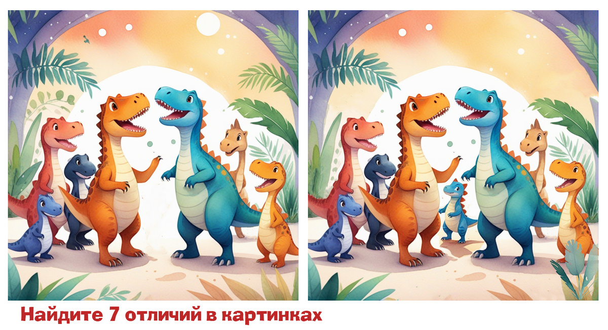 Как говорят палеонтологи: "Заметь мелкие кости – соберёшь целого динозавра." Сегодня в доисторическом парке шум и веселье. Дружелюбные тираннозавры что-то бурно обсуждают, а вокруг собралась целая компания. Кажется, встреча прошла на ура. Но что-то не так… То ли хвосты поменялись местами, то ли шипы на спине исчезли? То ли один из малышей подрос прямо на глазах? Найди 7 отличий и восстанови порядок в мире доисторических друзей. Горизонтальная картинка: Вертикальная картинка: Внимательный исследователь вроде тебя не упустит ни одной детали. Пусть день будет таким же весёлым, как эта встреча динозавров. До новой головоломки.