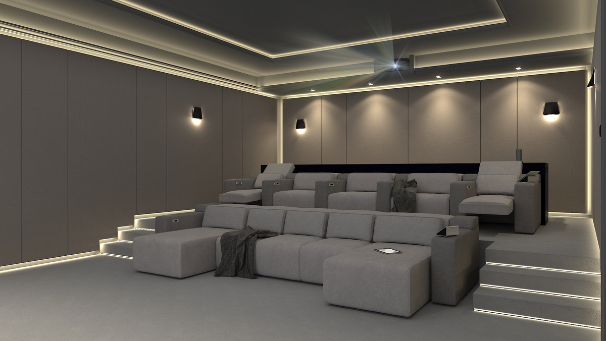 «Inspiration Things» в проекте стали рендеры интерьеров дома, от московской архитектурной студии. Стиль интерьеров дома — современная классика с элементами арт-деко. Мы старались разработать интерьер кинозала максимально близкий к дизайну дома.