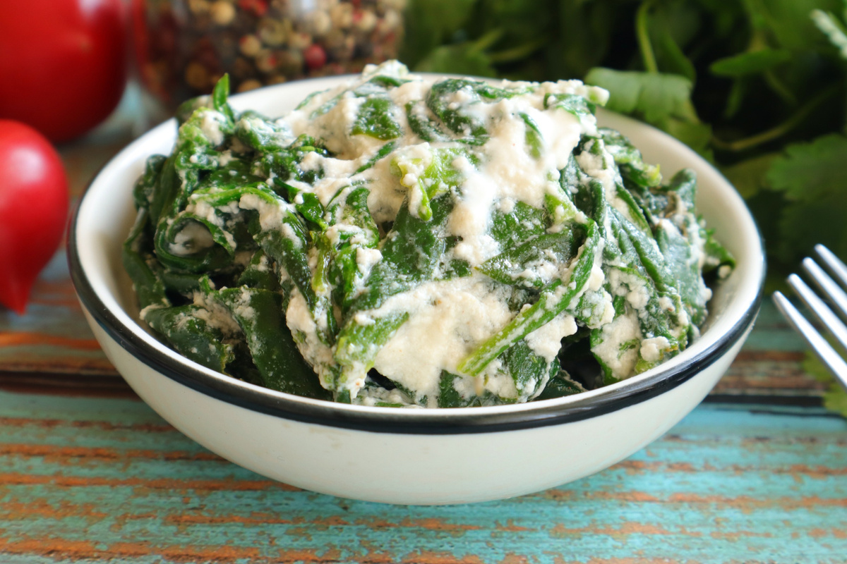 Сегодня готовлю шпинат с добавлением сметаны, но если вы любите более жирненькие блюда, то используйте для приготовления сливки 35% или каймак. Оба варианты будут вкусные. По рецепту этот шпинат нужно подать горячим, но попробуйте блюдо и в холодном виде, может вам так понравится больше. Готовить это блюдо просто и быстро, буквально за 15-20 минут шпинат можно будет подать к столу. Шпинат получается ароматный, сочный, насыщенный. Кто любит шпинат, тот оценит. Я даже думаю, что этот шпинат можно использовать как начинку для выпечки. Шпинат - 500 г. Сметана - 200 мл. Чеснок - 1 зуб. Мускатный орех - 1-2 щепотки Смесь свежемолотого перца - 1-2 щепотки Соль - по вкусу Масло оливковое - 2 ст.л. Для заправки, в удобную посуду выложим сметану, добавим молотый мускатный орех, свежемолотую смесь перца и соль. Ставим посуду на огонь и вывариваем заправку до средней густоты. Помешиваем. В рецепте рекомендовали выпаривать заправку пока не останется 4 ст.л. Мне кажется так вываривать слишком уж. На