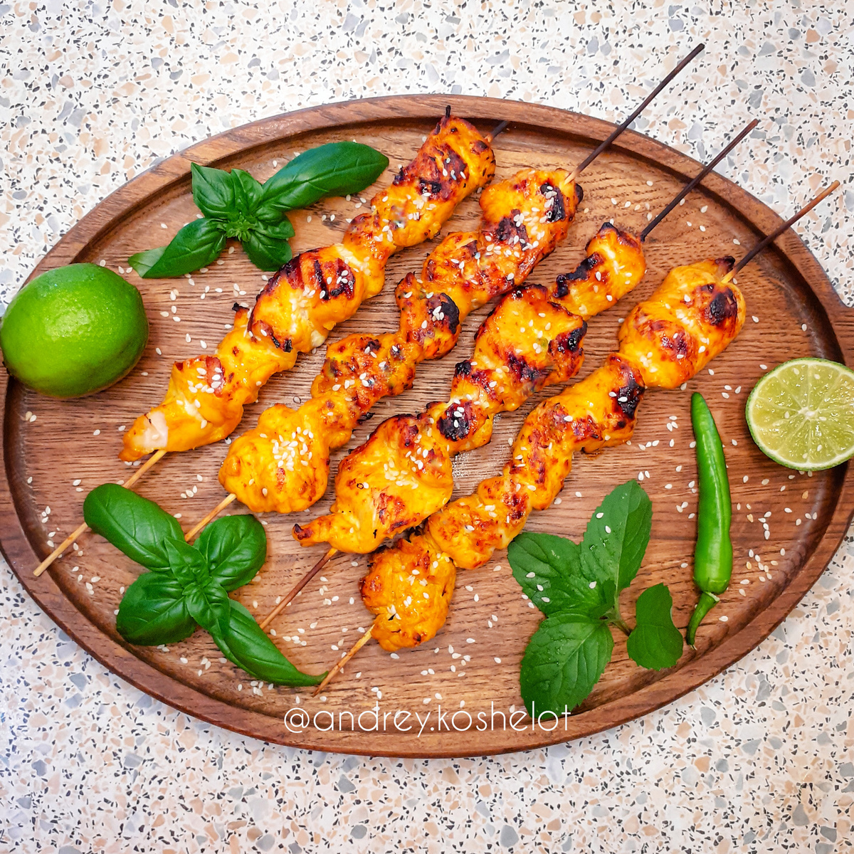 - Специи: куркума, паприка сладкая, молотый кориандр, галангал сушенный – не обязательно по желанию, соль. Количество по вашему вкусу. 1. Лук, чеснок, имбирь, перец, режем произвольно довольно мелко. 2. С лайма снимаем цедру. 3. Все отправляем в ступку или легче в блендер, но ступка круче! Перетираем-перемалываем. 4. В готовую смесь добавляем паприку, кориандр, куркуму, галангал – если есть, кунжутное масло или какое есть под рукой. Перемешиваем. 5. Теперь сахар, сок лайма, соль. 6. Грудку режем вдоль на средние полоски. Добавляем к ней готовый маринад, отправляем мариноваться в прохладное место на 12, а лучше 24 часа. 7. Змейкой насаживаем курочку на предварительно замоченные в воде шпажки. Обязательно счищаем маринад с грудки, подгорит. 8. Отправляем ша