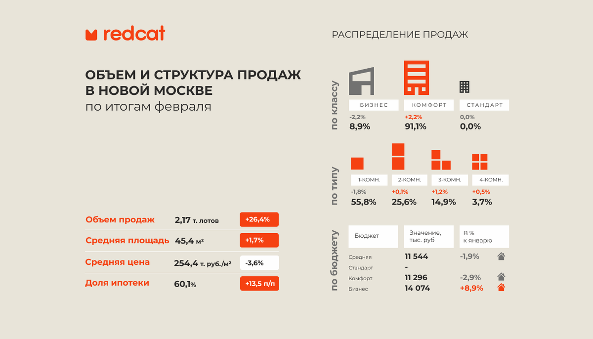 В Новой Москве в декабре спрос также пошел в рост, причем динамика прироста была настолько интенсивной, что показатели обогнали уровни осени прошлого года. По итогам месяца в Новой Москве было продано 2,17 тыс. квартир и апартаментов, что на 26,4% больше, чем в январе. Если сравнивать текущие показатели с прошлым годом, то февраль этого показал результаты почти в 2 раза лучше, выиграв у провального февраля 2023 года около 84,1%. В течение месяца более активно рос спрос в сегменте комфорт-класса, доступные новостройки прибавили 29,6% по количеству сделок, а более дорогие – только 1,0%. Так 91,1% (+2,2 п/п) всех сделок в Новой Москве приходится на новостройки комфорт-класса, доля бизнес-сегмента, сократилась на 2,2 п/п до 8,9%, продаж новостроек стандартного класса в феврале зафиксировано не было. Что касается структуры по количеству комнат, то наименее активно спрос подрастал в сегменте компактных лотов (+22,5%), а вот лоты с несколькими комнатами пользовались повышенной популярностью у