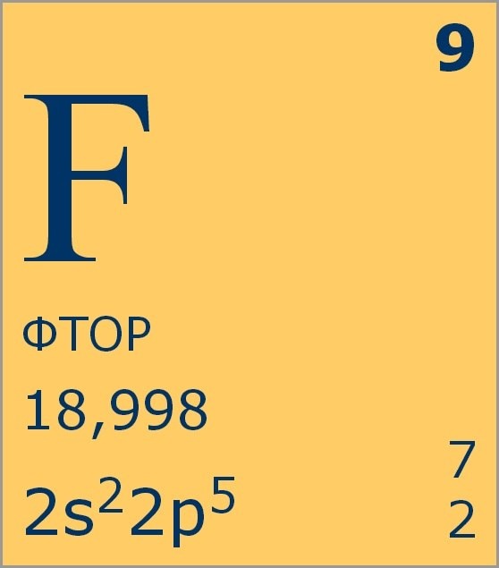 Фтор (химический символ — F, от лат. Fluorum) — химический элемент 17-й группы второго периода периодической системы химических элементов Д. И. Менделеева с атомным номером 9. Является самым химически активным неметаллом и сильнейшим окислителем. Фтор относится к группе галогенов и является самым лёгким элементом из этой группы. Как простое вещество (при нормальных условиях) фтор — это двухатомный газ (формула — F2) бледно-жёлтого (в толстых слоях — зеленовато-жёлтого) цвета с резким запахом, напоминающим озон или хлор. При криогенных температурах представляет собой жёлтую жидкость или бледно-жёлтые кристаллы. Чрезвычайно токсичен. Обладает исключительно высокой коррозионной активностью. Природный фтор состоит из одного стабильного изотопа 19F. Искусственно получены пять радиоактивных изотопов. Фтор является жизненно необходимым для организма элементом. Основным источником поступления фтора в организм человека является питьевая вода. В организме человека преобладающая концентрация фтор