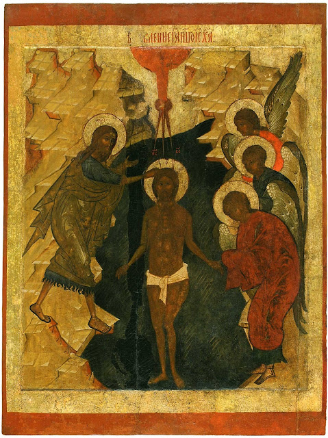 Предтеча повинуется Пришедшему спасти мир, и с ужасом взирает, как Он, Сый сияние славы Отчей, готовясь погрузиться во Иорданския струи, слагает с Себя, как последний из грешников, все свои одежды. По словам Церкви, - "ужас бе видети небесе и земли Творца, на реце обнажшагося и крещение от раба за наше спасение приемлющаго яко раба: и лицы ангельстии дивляхуся страхом и радостию!" (Служба 6 янв., стих. 6 часа).