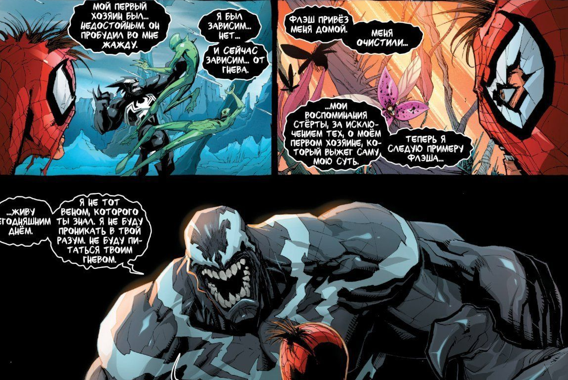 Это «Веном» том 2, глава 0. Здесь симбиот Веном уже давно не с Эдди Броком (более того, он успел побывать на тушке Гаргана, оригинального Скорпиона) и используется военными в качестве основы для проекта «Возрождение 2.0». Суть проекта в создании своеобразного экзоскелета для покалеченных военных, дабы они смогли продолжать приносить пользу Родине. Испытуемым... вторым испытуемым стал знакомый многим капрал Томпсон. Тот самый «Флэш», что в школе доставал Питера, затем подружился с ним в университете, а после потерял ноги в Ираке. Это очень сжатый пересказ, но подобный факт стал для меня открытием, ибо как-то я не шибко интересовался «Флэшем». Anyway, именно его взяли в качестве подопытного, накачали химией и дали Венома, что по воле Томпсона «отрастил» Юджину (да, «Флэша» зовут Юджин) ноги. Нюанс в том, что, как выяснили учёные, до создания прочной связи с Веномом есть 48 часов. Иными словами, 48 часов симбиота можно носить безопасно, а затем он начинает влиять на флягу (проявляется агрессия хозяина, например). Отныне вот эту сборку, созданную в рамках «Возрождения 2.0», стали звать «Агент Веном».