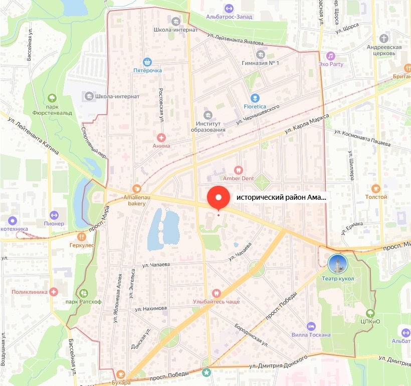 Амалиенау — исторический район в западной части Калининграда. Сейчас он входит в состав Центрального района города. Название район получил в честь одноимённой дворянской усадьбы, располагавшейся здесь задолго до начала строительства престижных домов. Среди достопримечательностей Амалиенау можно выделить: Квартал Амалиенау ограничен улицами Красной, Лесопарковой, Яналова и проспектом Победы. Еще в комплекс Амалиенау входит парк Центральный (парк Калинина) с кирхой Королевы Луизы - ныне театр кукол - с летним домом королевы Луизы, ротондой и другими достопримечательностями. Нынче парк выглядит так: Но, мой совет, не ограничивайте себя просмотром фото. Вы много потеряете, если не посетите эти прекрасные исторические места!