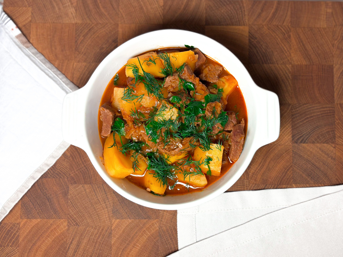 Гуляш считается национальным достоянием Венгрии, ведь именно там он взял свое начало. Но свою аудиторию он нашел во многих странах. Интересный факт, что гуляш внесен в перечень ЮНЕСКО как нематериальное культурное наследие человечества. Изначально он состоял из говядины, картофеля, лука и паприки. Поэтому рекомендую подавать его, основываясь на традициях, именно с картошкой или пюре. Ингредиенты: Приготовление: Говядину промойте, удалите жилки. Нарежьте на кубики среднего размера 2-3 см. Лук мелкими кусочками. Картошку помойте, почистите и порежьте. На сковородке разогрейте сало или масло. Обжарьте лук до золотистого цвета в течение 5-7 минут. Добавьте говядину и обжаривайте до румяной корочки, помешивая, 10 минут. Вмешайте паприку, перец, соль, перемешайте. Добавьте нарезанный картофель. Залейте водой, чтобы покрыть все ингредиенты. Тушите на медленном огне, периодически помешивая, 1,5-2 часа. Время тушения может варьироваться в зависимости от качества мяса. Гарнир: если вы не люби