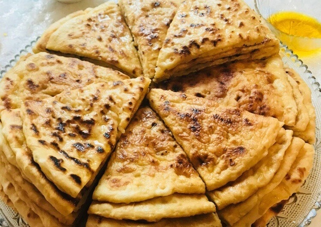 Раскатать 2 тонкий кружочка по размеру сковородки и выложить начинку на один курс и накрыть другим и защипнуть края и жарить на сухой сковороде( без масла) с двух сторон до золотистой корочки и смазать сливочным или топленым маслом!