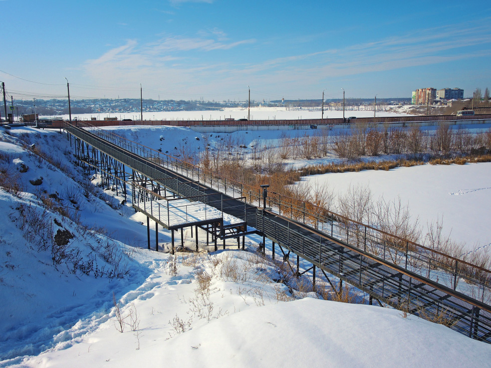 По предварительному впечатлению, это самый спорный участок набережной. Напомню, две предыдущие очереди были устроены ниже по течению Крымзы, за Ильинским мостом, около впадения реки в Сызранку. Самое главное их отличие - они находятся далеко от жилья. Первая очередь расположена у подножия кремлёвского холма. По сути это большая площадка, подходящая для проведения массовых праздников. Вторая вытянута вдоль берега, но находится значительно ниже и проезжей части, и жилых домов, в том числе многоэтажных. А вот третья проложена прямо через частный сектор и проходит вдоль чьих-то заборов. Также довольно странно выглядят металлические спуски. Зимой я не решился бы спускаться по такому, даже если бы у меня было на это время. Думаю, всё-таки эту часть лучше осматривать летом. Хотя, в хорошую погоду и зимой (в нашем случае очень ранней весной) неплохие снимки тоже можно сделать.