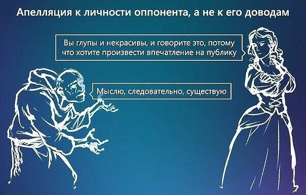 Здесь вместо того, чтобы обсуждать сам аргумент, софист переходит на личность оппонента. Примером может быть известное выражение: «Молод меня еще учить», -- а ведь этот, к примеру, молодой специалист может обладать более современными, точными знаниями. Или вот еще: «Да что Вы его слушаете, его никто здесь не уважает, у нас все над ним смеются!», -- можно представить, как в те давние времена смеялись крестьяне и ремесленники над чудаком сбрасывавшем с Пизанской башни предмет за предметом и что-то там себе при этом записывающем, измеряющем.