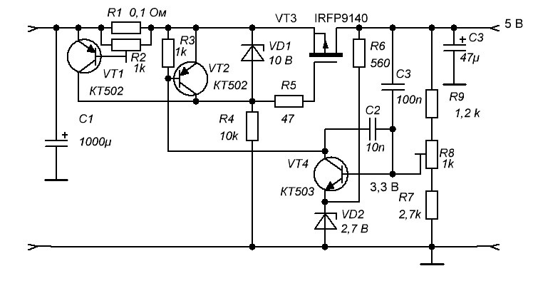 Вариант со стабилизатором тока. Актуален только для стабилизатора с регулируемым в широких пределах выходным напряжением. В качестве регулирующего элемента использован полевой транзистор с каналом Р типа. При подаче питания полевой транзистор открывается напряжением, подаваемым на затвор через резистор R4. Стабилитрон VD1 защищает затвор от перенапряжения. Как только напряжение на базе транзистора VT4 окажется выше напряжения на его эмиттере примерно на 0,6 В, транзистор VT4 открывается. Это приводит к увеличению падения напряжения на резисторе R3.