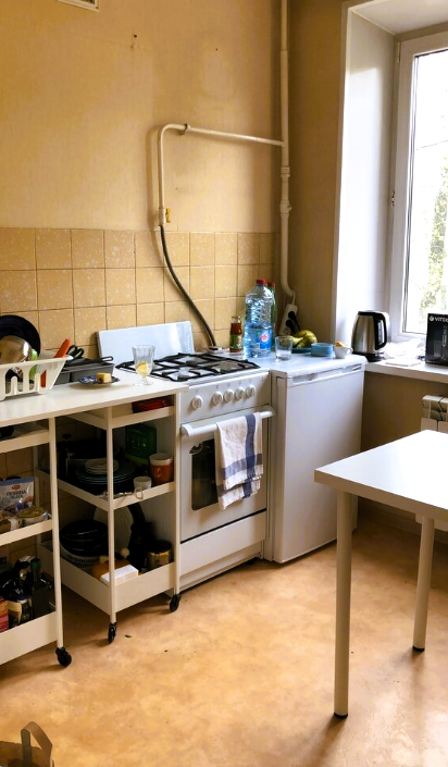 Наша героиня — Надя Полякова, талантливый дизайнер, искала небольшую квартиру, в которой она могла бы жить несколько лет. Через 5-6 лет она планирует продать это жильё и при возможности приобрести более просторное. Из-за ограниченного бюджета её выбор пал на миниатюрную «хрущёвку» площадью 29 квадратных метров (с учётом балкона — 31,7 квадратных метров). Выбирая жильё, Надежда сразу обратила внимание на однокомнатную квартиру, расположенную в углу здания. Несмотря на небольшую площадь, это позволило бы ей создать две отдельные зоны с окнами, что значительно улучшило бы её жилищные условия. Хозяйка квартиры лично занималась её дизайном, стремясь создать здесь уютное и функциональное пространство, где каждый сантиметр площади был бы задействован. Во входной зоне пол покрыт светлой плиткой, которая отлично сочетается с жёлтой краской на стенах. Хозяйка специально выбрала этот оттенок, чтобы создать атмосферу радости, солнечного света и позитива. Напротив входа была установлена большая си