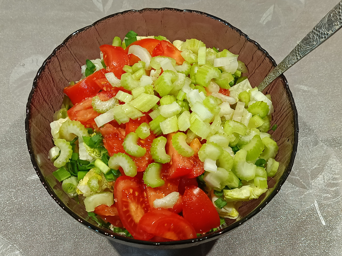 Всем здравствуйте. С тех пор , как я перестала не любить сельдерей , у меня появился новый любимый салат, который я ем обычно на ужин ( на обед тоже в самый раз ). Салат самый простецкий, но всё таки расскажу, вдруг кому пригодится. Расскажу со всеми нюансами. Почему я не любила сельдерей ? Из-за его резкого запаха и вкуса. Поэтому сейчас я делаю так . Стебли сельдерея мою, немного чищу, если кожица жестковата, режу и вымачиваю в холодной воде часа 2 , 2-3 раза меняя воду, он становится негорьким и сочным. Если сезон и есть свои домашние огурчики , то я их не чищу. Если зима и огурцы и помидоры из магазина, то огурец ( они обычно большие ) чищу от кожуры и нарезаю. Помидоры нарезаю и чуточку посыпаю сахаром, буквально полчайной ложки, они становятся немного ближе по вкусу к моим домашним. 😊 Нарезаю редиску и салат айсберг , иногда использую пекинскую капусту, но айсберг вкуснее, а иногда беру и то , и то. Зелень любую по вкусу, какую любите. Всё это дело в салатник , в конце добавляю