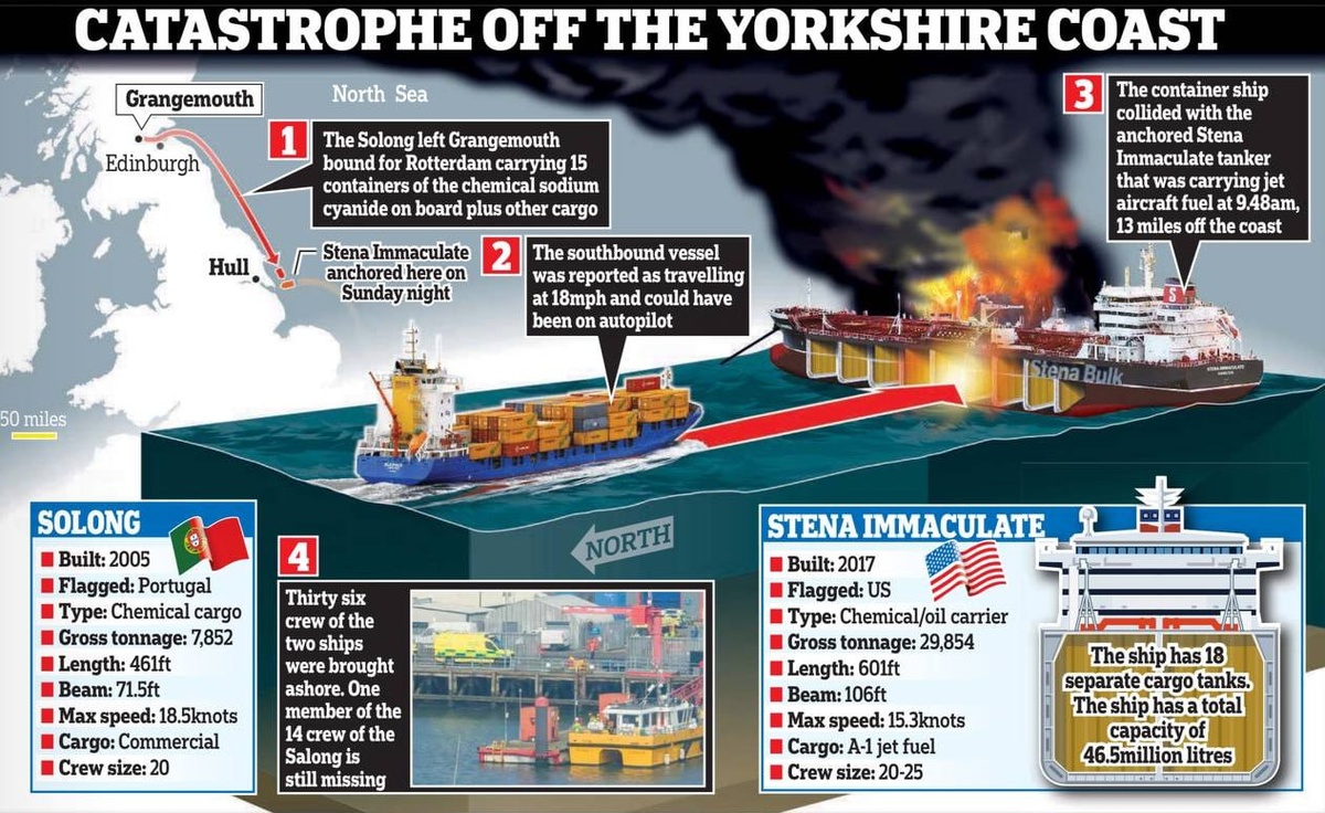 “Контейнеровоз появился из ниоткуда” – моряк о столкновении в Северном море Поиски пропавшего члена экипажа прекращены сегодня. Моряки с американского танкера, который в понедельник столкнулся с контейнеровозом, рассказали, что судно появилось буквально из ниоткуда, прежде чем врезаться в них. Журналисты CBS и BBC пообщались с членами экипажа танкера "Stena Immaculate" (дедвейтом 49 700-t, постройки 2017 г.), который загорелся после удара 804-teu контейнеровоза "Solong" (постройки 2005 г.). Столкновение вызвало несколько взрывов, а на обоих судах вспыхнул пожар.