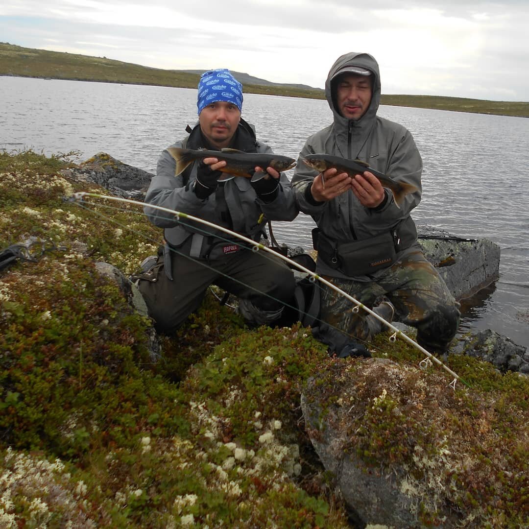 На утро позавтракали. Задул сильный ветер и было принято решение побегать на домашнем озере. Игорь с Ванькой убежали по местам, где были в первый день. Я решил несильно отдаляться от лагеря и прокидывал с подветренного берега. В итоге поймал небольшого гольчика, который был успешно отпущен подрастать. Чуть позже, вернулись товарищи. Игорь хвастается неплохой кумжей. А Ванька опять подержал неплохую пятнистую, но подсачека не оказалось рядом и трофей был упущен😕.