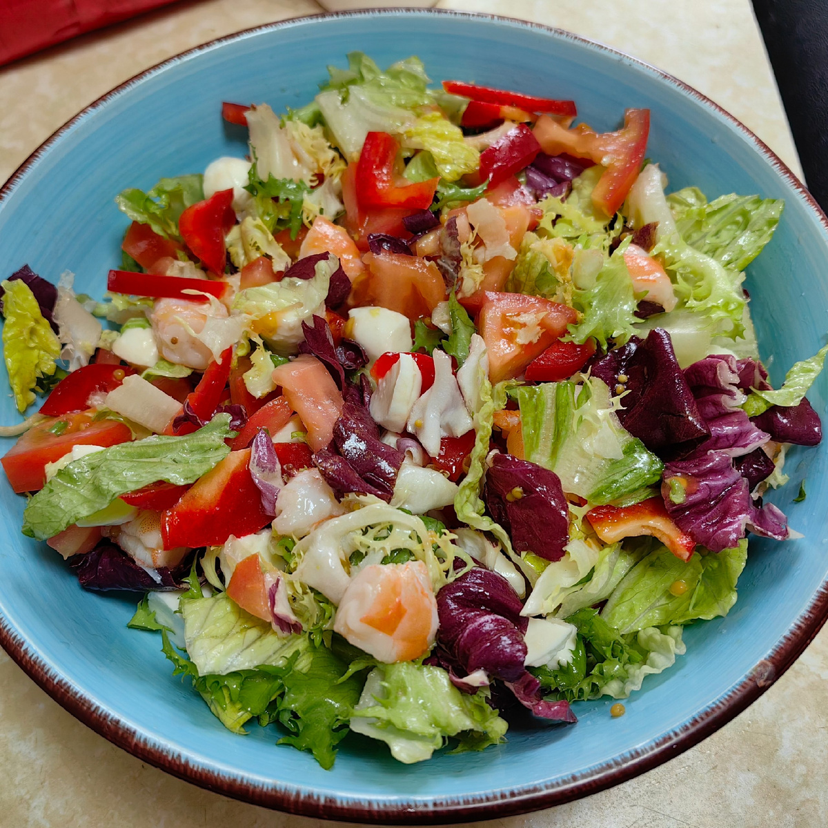 Креветки эти, салат... купила для него впервые микс зелени. На пачке было написано, что ее уже три раза помыли, не надо больше. Зелень мытая, креветки вареные - как многое упростилось в современном мире.