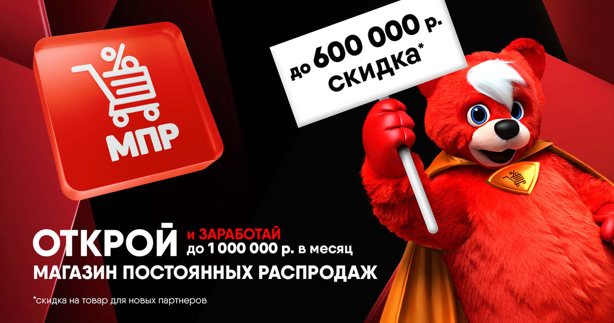 Наценка на товары: от 58% Откройте свой первый Магазин Постоянных Распродаж с выгодой до 600 000 рублей. Инвестируйте в розничную сеть с ассортиментом непродовольственных товаров повседневного спроса и получите скидку до 15% или до 600 000 рублей от суммы первого заказа товара при открытии первого магазина «МПР» в городах, где еще не представлены магазины МПР или Галамарт.