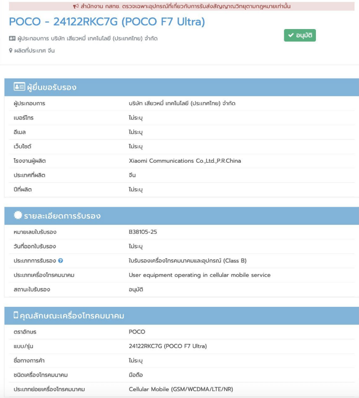 Бренд Poco, как ожидается, представит серию Poco F7 для глобального рынка в конце этого месяца. По слухам, в линейку войдут Poco F7 Pro и Poco F7 Ultra. Перед запуском Poco F7 Ultra был замечен в базе данных сертификационного органа NBTC Таиланда, подтверждая его название и номер модели. Согласно списку NBTC, Poco F7 Ultra имеет номер модели 24122RKC7G. Хотя сертификация подтверждает существование устройства, она не содержит подробностей о его технических характеристиках. Однако утечки предполагают, что F7 Ultra будет переименованной версией Redmi K80 Pro, который был запущен в Китае ещё в ноябре 2024 года. Устройство также недавно было замечено в базе данных Geekbench AI, которая раскрыла ключевые детали оборудования. Ожидается, что телефон будет работать на чипсете Snapdragon 8 Elite в сочетании с 16 ГБ оперативной памяти и под управлением ОС Android 15 с оболочкой HyperOS 2.0. Ожидаемые характеристики Poco F7 Ultra: Учитывая сходство с Redmi K80 Pro, грядущий Poco F7 Ultra может пол