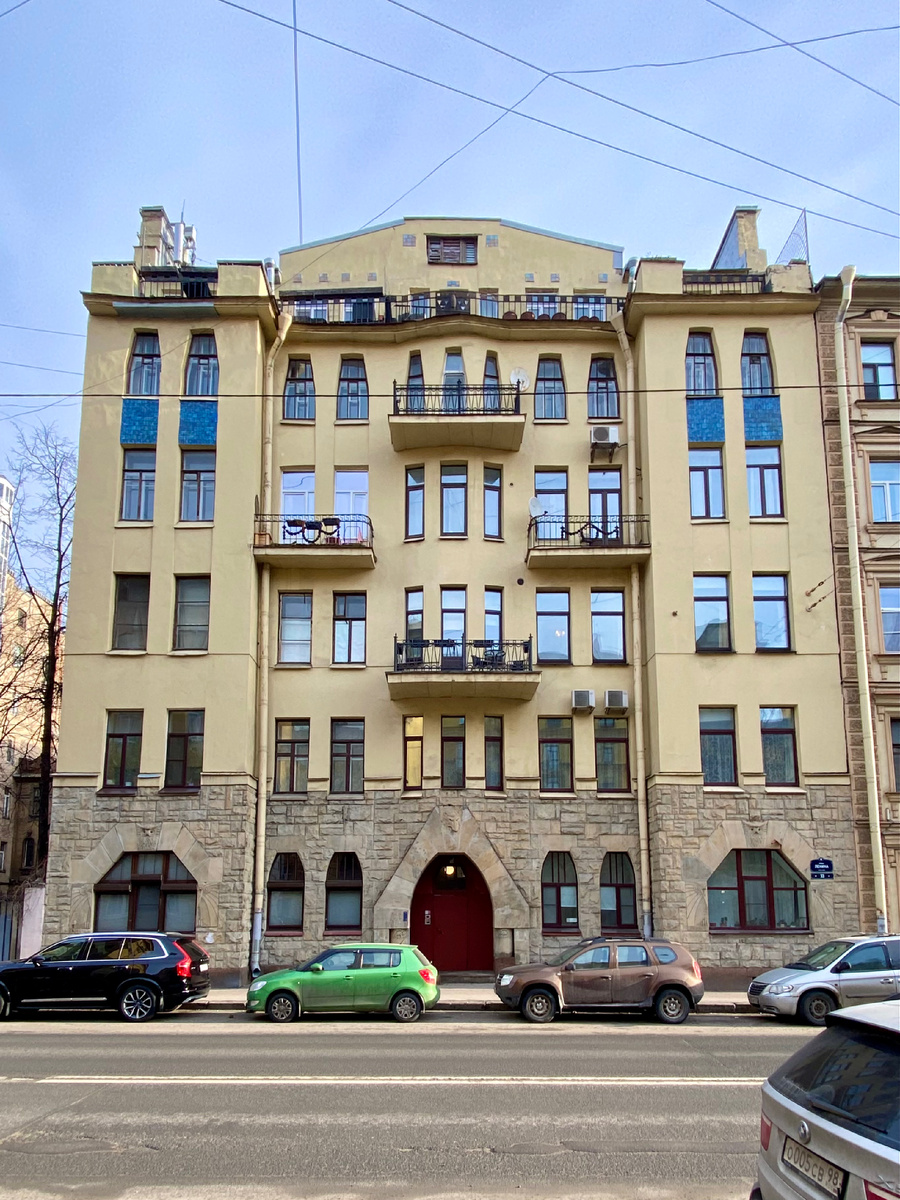 Окна различных размеров и форм, интересно расположенные балконы, керамическая плитка и «северная» рустовка первого этажа с непременными птицами и необычно суровым медведем на замковом камне над парадной.