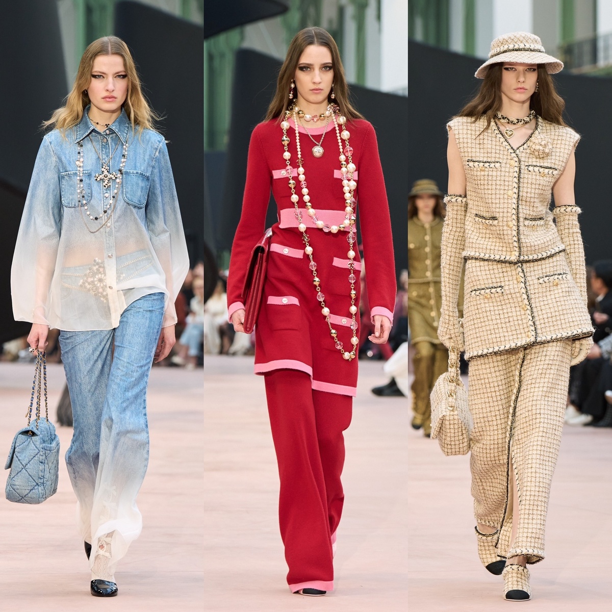 Грандиозный показ без креативного директора В этом сезоне Chanel оказался в уникальной ситуации: бренд остался без креативного лидера, но продолжает уверенно идти вперёд. Показ коллекции осень-зима 2025/26 в Гран-Пале стал символом стойкости модного дома. Главный визуальный элемент — огромная черная лента из стали длиной 368 метров, опоясывающая подиум, — словно метафора прочности и вечной актуальности Chanel. Несмотря на то, что должность креативного директора пока вакантна (ожидается, что Маттье Блази вступит в роль в следующем месяце), студия Chanel справилась с задачей на отлично, выпустив коллекцию, основанную на классических кодах бренда. Образы, пропитанные ДНК Chanel Коллекция напоминала о Коко Шанель и её культовом стиле. Всё, что мы любим в этом доме моды, здесь было представлено в современном прочтении: твидовые костюмы, жемчуг, черные банты и изысканный минимализм. • Твидовые костюмы в оттенках сливок, классического черного и помадного красного выглядели традиционно, н