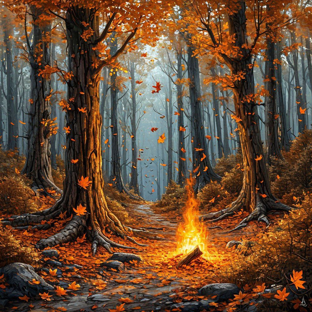 Деревья здесь — живые факелы, чьи стволы состоят из пламени, не сжигающего, а дарующего тепло. Листья-искры опадают, превращаясь в бабочек из огня, которые разносят жар по всему лесу. В чаще обитают фениксы, вьющие гнезда из пепла, и духи вулканов, играющие на барабанах из лавы. Раз в столетие лес угасает, открывая путь к Жерлу Игниса — кратеру, где рождаются новые звезды. Те, кто бросит в него свое самое дорогое воспоминание, получат уголь, способный разжечь пламя в мертвой душе.
