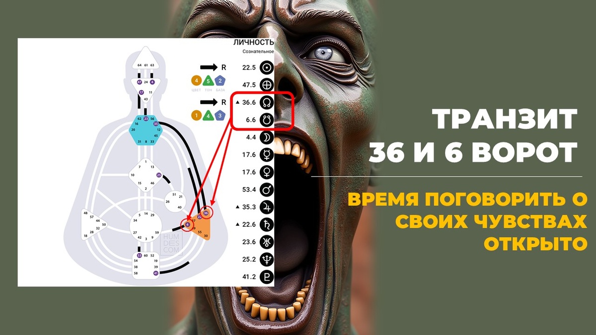 Наверняка, многие заметили, что весь февраль и начала марта были крайне эмоционально нестабильными. Мягко говоря. Особенно это коснулось людей с открытым эмоциональным центром. А еще больше тех, у кого есть 59 (Сакральный центр) и 35 (Горловой центр) ворота. Сегодня мы проживаем мощный астрологический транзит, при котором лунные узлы определили 36-е и 6-е ворота. И это очень чувствуется, потому что все что качается эмоционального центра – это всегда горячо. А во вторых, потому что транзит затронул именно Лунные Узлы, которые отвечают за коммуникации с окружением. Это та среда, та плодородная почва, которая питает нас необходимыми "ингредиенами" для реализации нашей цели и роли. Через эту среду проявляется наша индивидуальность. В контексте транзита 36-х и 6-х ворот в лунных узлах, мы видим следующее. Плодородной почвой для развития становятся эмоциональные кризисы и внутриплеменные конфликты. 6 ворота. • Связаны с фундаментальным законом прогресса через трение • Являются частью канала