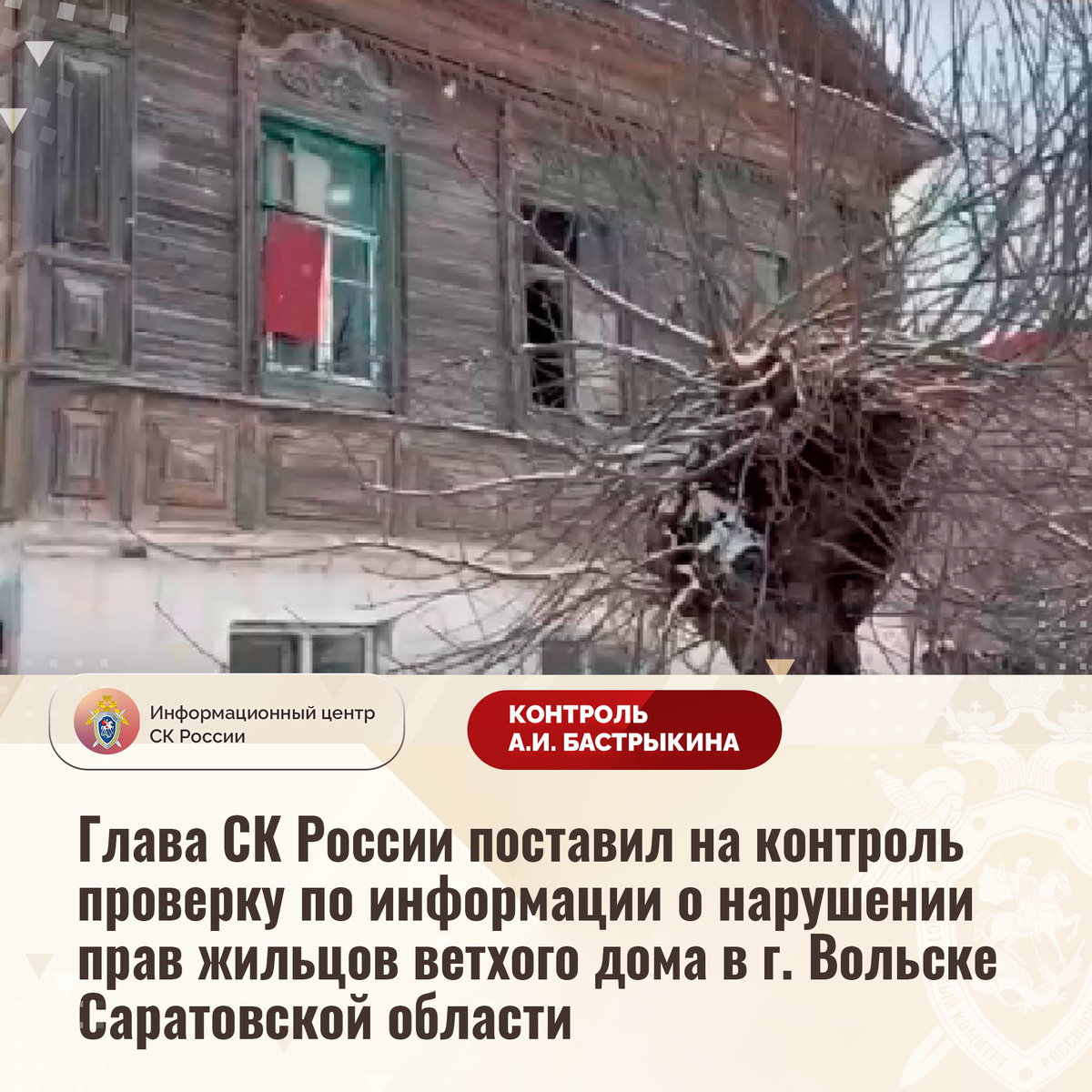 Глава СК России поставил на контроль проверку по информации о нарушении прав жильцов ветхого дома в г. Вольске Саратовской области