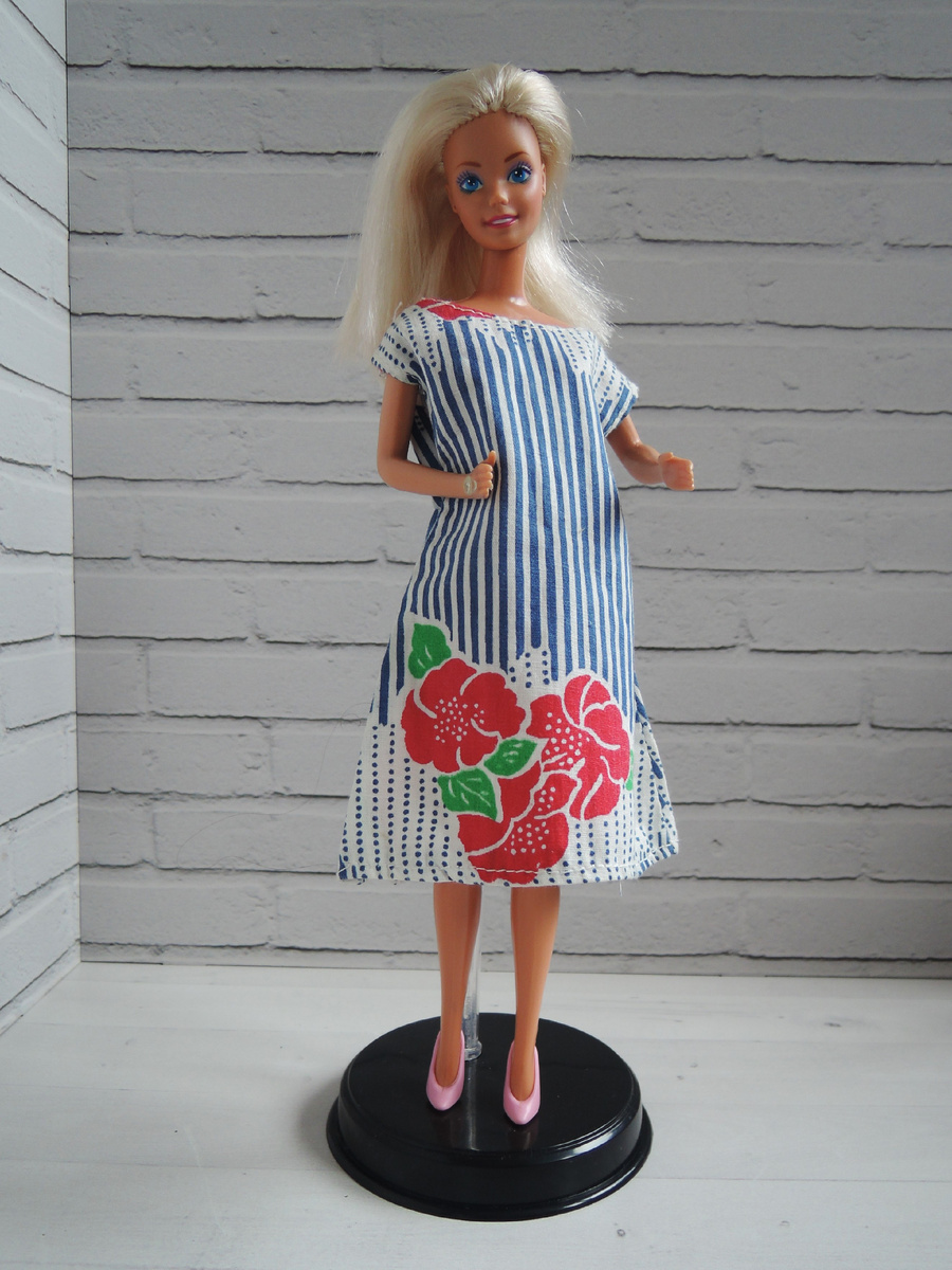 У меня давно лежал этот трикотаж: белый, с яркими разноцветными тюльпанами. Когда моё платье было готово, я из остатков решила сшить для своей Барби точно такое же. Только оно получилось намного короче, так как материала осталось немного.