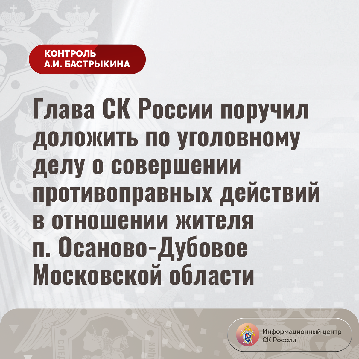 Глава СК России поручил доложить по уголовному делу о совершении противоправных действий в отношении жителя п. Осаново-Дубовое Московской области К главе СК России А.И. Бастрыкину в его приёмную «ВКонтакте» обратился житель Московской области. Он выражает несогласие с ходом установления обстоятельств совершения в отношении него противоправных действий. В июле 2023 года в поселке Осаново-Дубовом неустановленное лицо произвело два выстрела из охотничьего ружья в окна домовладения мужчины. Однако до настоящего времени виновный не установлен и к ответственности не привлечен. В ГСУ СК России по Московской области расследуется уголовное дело. Председатель Следственного комитета Российской Федерации Александр Иванович Бастрыкин поручил и.о. руководителя ГСУ СК России по Московской области Ярославу Александровичу Яковлеву представить доклад об установленных в ходе первоначальных следственных действий обстоятельствах, а по завершении расследования уголовного дела – о его результатах. Исполнение