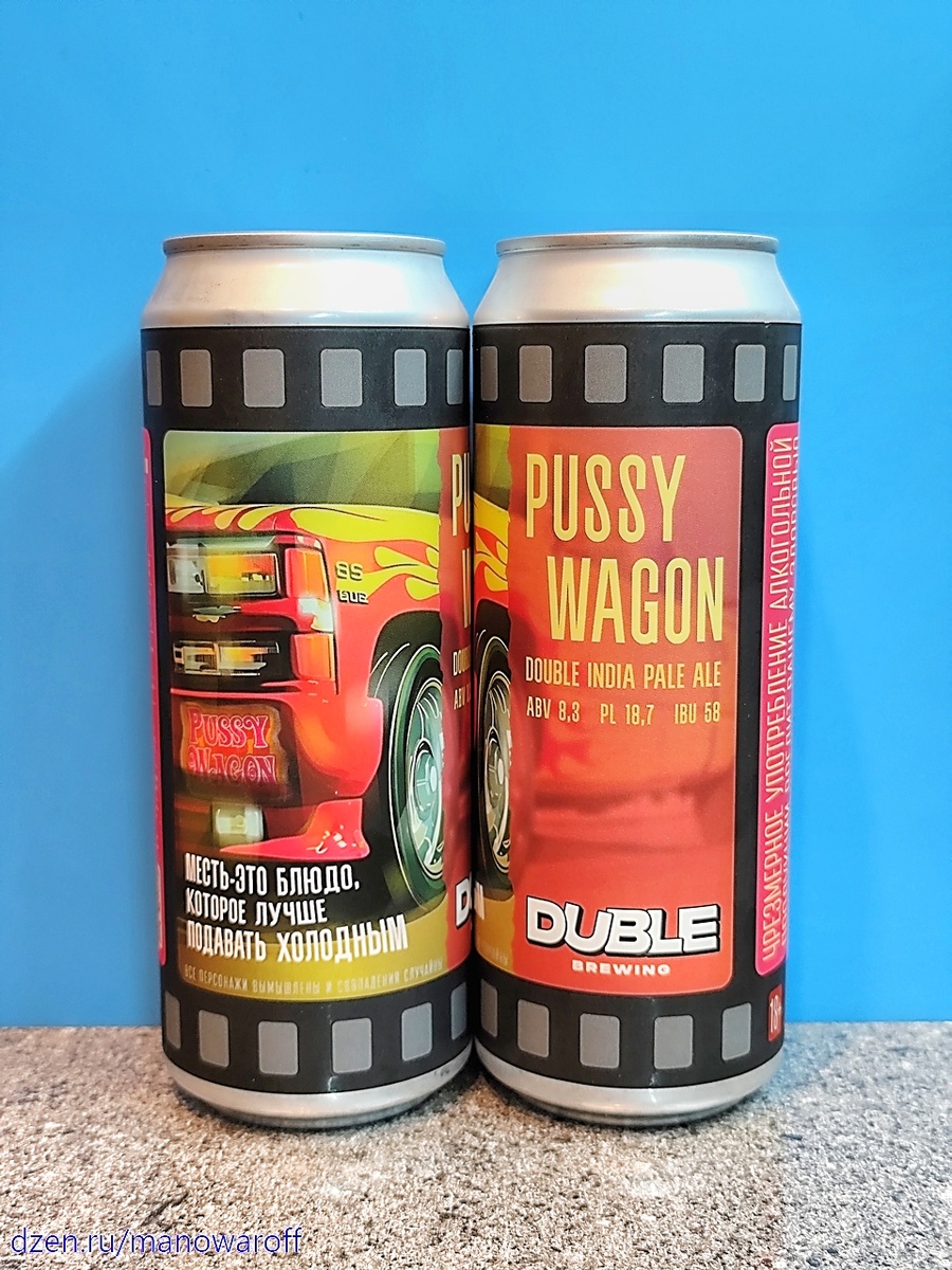 Как бы их поцензурнее назвать, чтобы статью не забанили? А, вагон кисок, скажем так. Сегодня у нас пивоварня Duble с пивом Pussy Wagon. Появился сорт в конце января нынешнего года. У меня банка из первой партии, а попробовал я сей пивас через полтора месяца после розлива. Срок годности составляет 365 суток при хранении в холодильнике. Посвящено пиво, как обычно, какому-то фильму, который я, разумеется, не смотрел. Если кто угадал, что это за кинишко, пишите в комментах. Ничего интересного про пиво нам не рассказывают, так что будем пробовать без лишних разговоров. ТТХ: Пиво чуть мутноватое, прозрачное. Пены прилично и она достаточно стойкая. Аромат цитрусово-тропический, с сосновыми нотками. Во вкусе солод, сладкая груша и легкие цитрусовые оттенки. В послевкусии к ним присоединяется заметная смолянистая горечь. Алкоголь в органолептике отсутствует, пьется легко. В принципе, если бы не излишняя сладость, то было бы неплохо, восьмерочку поставил бы. Ну а так семь баллов. В "Леще" стоит