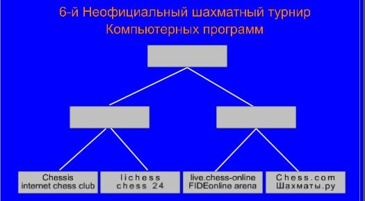 6-й Неофициальный шахматный турнир компьютерных программ 🎮 6-й Неофициальный шахматный турнир компьютерных программ 📋 Турнирная сетка (кубковая система) 🏆 1/4 финала: ⚔️ Матч 1: Chessis vs Internet chess club ⚔️ Матч 2: lichess vs Chess24 ⚔️ Матч 3: live.chess-online vs Fide online arena ⚔️ Матч 4: Chess.com vs Шахматы.ру от Яндекса 🏁 1/2 финала: ⚔️ Матч 5: (Победитель Матча 1) vs (Победитель Матча 2) ⚔️ Матч 6: (Победитель Матча 3) vs (Победитель Матча 4) 🎯 Финал: ⚔️ Матч 7: (Победитель Матча 5) vs (Победитель Матча 6) 🎯 Матчи проводятся по системе “лучший до трёх побед ”. 📅 Расписание матчей будет опубликовано дополнительно. 📊 Следите за турнирной таблицей и результатами матчей в режиме реального времени...