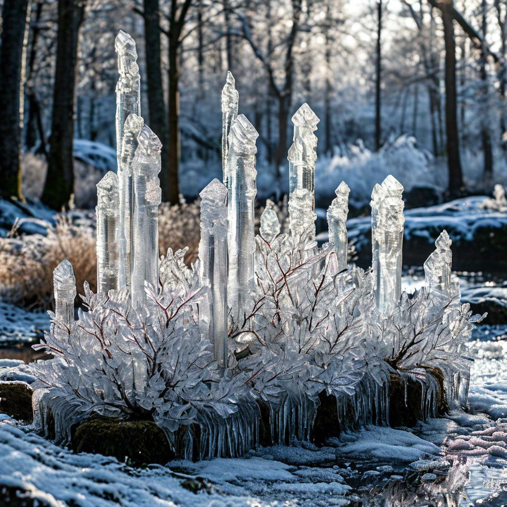 В царстве вечной зимы раскинулись сады из прозрачного льда, где каждое растение — хрустальная скульптура, созданная морозным дыханием ветров. Структуры здесь меняют форму, реагируя на звуки: пение вызывает рост ледяных цветов, а барабанный бой — появление арок и мостов. В центре садов стоит Дворец Эфириона, чьи шпили пронзают облака. Его стены украшены рунами, светящимися синим пламенем, а внутри живут духи холода, чьи голоса звенит, как колокольчики. Ночью лед излучает мягкое свечение, раскрывая подземные гроты с озерами жидкого света.