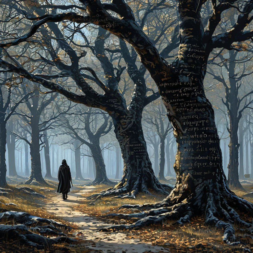 Деревья здесь черные, с корой, покрытой узорами, напоминающими письмена. Их листья — это не листья, а сгустки тьмы, которые тихо шелестят, повторяя последние слова путников, забредших сюда столетия назад. Между стволами скользят полупрозрачные тени-проводники, предлагающие провести вас к «Ядру Леса» — месту, где растет Древо Истоков. Его корни уходят в подземные реки расплавленного серебра, а плоды, если их сорвать, превращаются в карты неизведанных миров. Но будьте осторожны: те, кто теряется в лесу, становятся частью его теней, обреченными шептать предупреждения новым гостям.