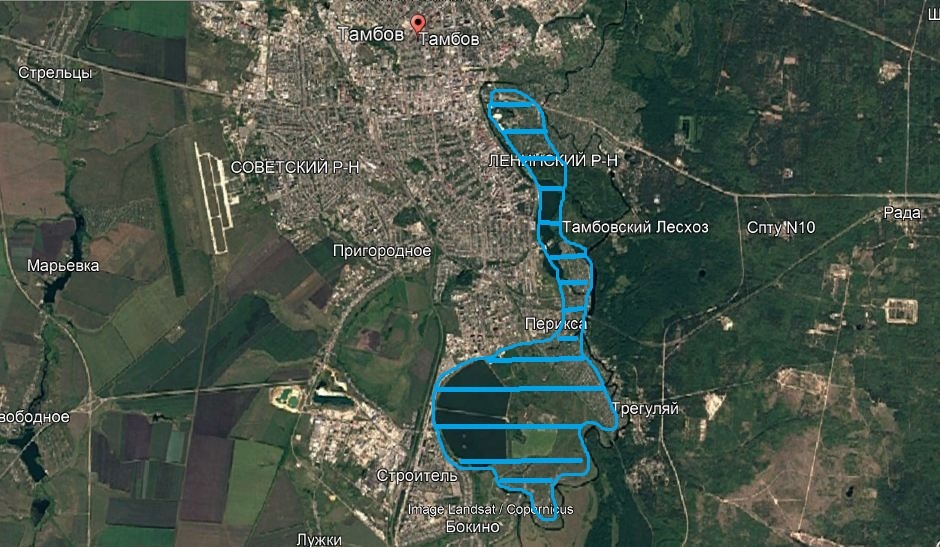 Версия по теории русловых названий(ТРН). Тамбов уже достаточно южный равнинный город и воды в этих местах не так много, по сравнению с Северо-Западом России. Поэтому найти место с большой водой-это удача. Там-бо-ва- "там большая вода", три сокращённых слова вместе. Слог "ва"-вода попадается в названиях рек довольно часто. Вероятно низина и пруды Бокинского рыбхоза в те времена были одним водоёмом, а это примерно 7 километров от центра Тамбова. Река Лесная Тамбова, ещё до плотины вероятно была сильно заболочена в том месте. Вопрос, что было названо первее, Лесная Тамбова или город Тамбов, остаётся открытым.