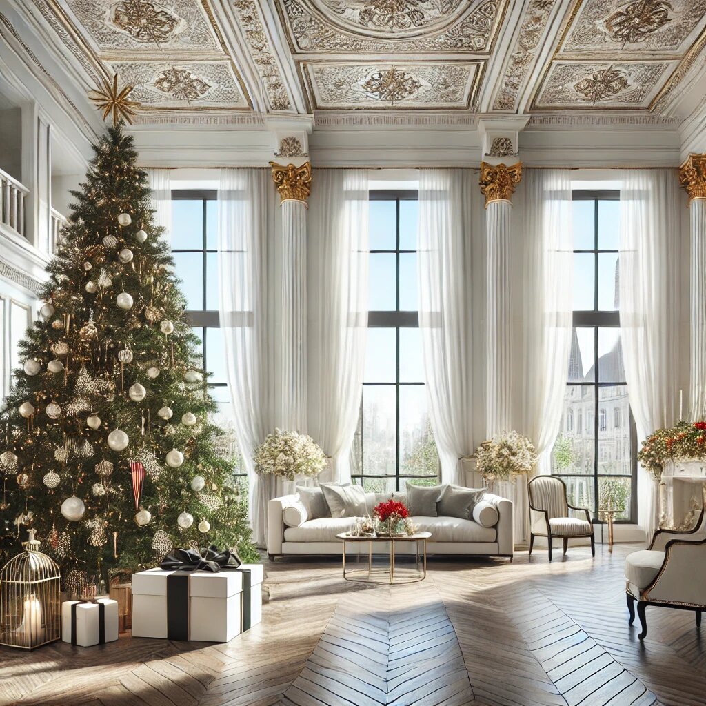 - Потолки 3,5 м и выше: простор для творчества. Здесь уже можно задуматься о более внушительных ёлках высотой 3 метров или даже выше, если вы хотите произвести яркое впечатление на всех, даже на себя (шутка?)