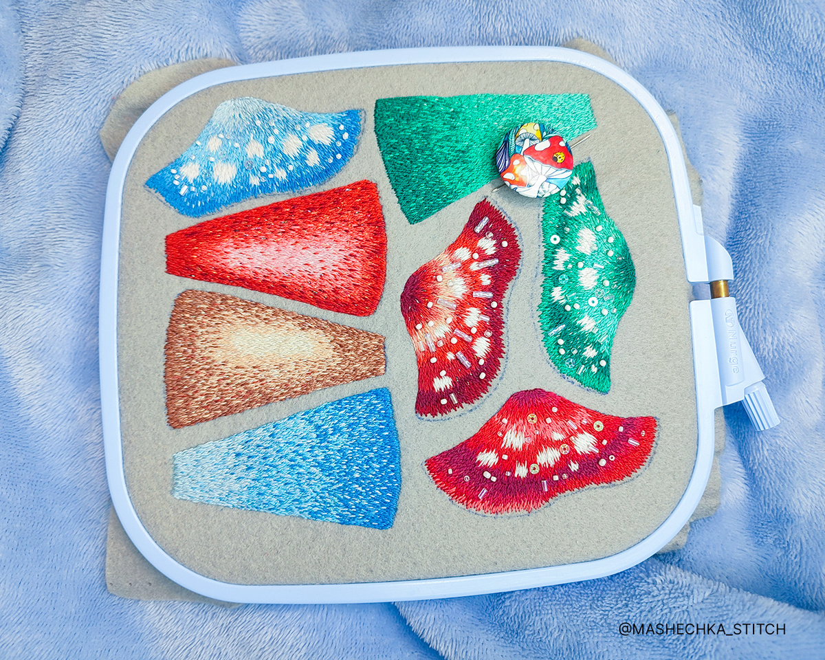 В этот раз буду не многословна, а просто покажу продвижения. Они не такие большие, как я надеялась. Все же я немножко устала от этой работы, начала отвлекаться на другие процессы. Но стежки все вышиты, даже пришила бисер со стразиками на шляпки. Теперь думаю, делать ли мне некое подобие юбочки или уже остановиться на усовершенствованиях. Осталось оформить оборот и можно вырезать детали, приступать к сборке.