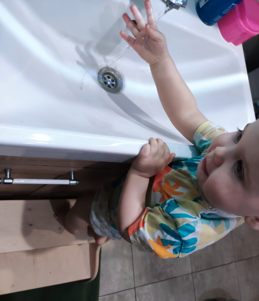 Саша привык к ней сразу. После прогулки даже сам бежит ставить и мыть руки. Мешает лишь, что ступенька для него тяжёлая. По краям у неё есть бортики, они успели пригодиться. Один раз Саша завтыкал и упал с неё, но с тех пор он более внимательный.