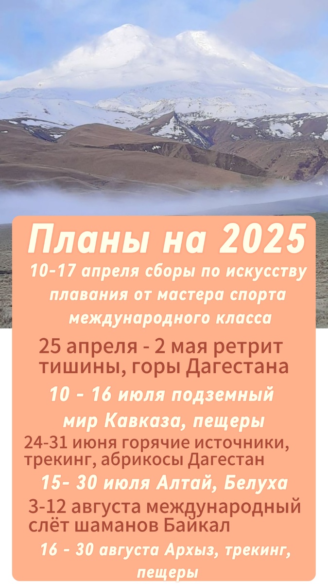 Планы на 2025 год 10-17 апреля уникальнейшие сборы ретрит от легендарного тренера. Сборы по плаванию будут проходить в бассейне рядом с морем. Три тренировки в день, две на воде и одна ОФП. Это прекрасная возможность для любого уровня подготовки подтянуть себя перед сезоном и наконец-то научиться плавать – гармонично, стабильно, в потоке. Видео с тренером на канале. 25 апреля – 2 мая ретрит «Тишина» в горах Дагестана. За основу этого ретрита взята классическая випасана, где медитация сидячая чередуется с размеренными шагами. Никакой идеологии, новых знаний – лишь созерцание себя, своего ума. После ретрита возможно будет трекинг. 10-16 июня подземный мир Кавказа, трекинг и пещеринг – посещение пещер Адыгеи и Краснодарского края, пещеры начального уровня без специального снаряжения, а внутри медитация, трансформация. 24-31 июня горячие источники, трекинг, абрикосы, Дагестан. Этот тур направлен больше на ЗОЖ практиков, упор будет делаться на питание только абрикосами - моносыроедение и