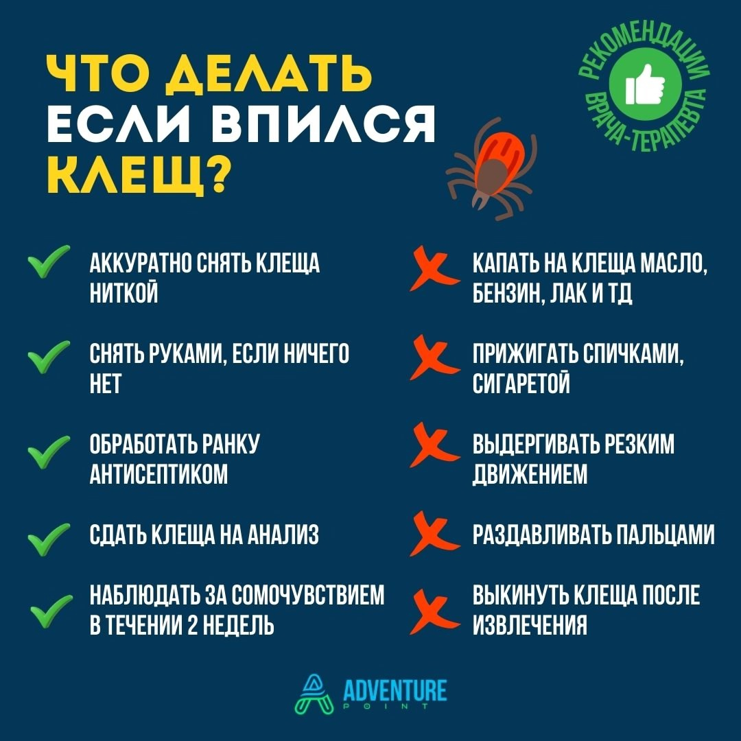 Запорожец Светлана Константиновна — терапевт, эндокринолог с 43-летним стажем, заслуженный врач Свердловской области, специалист Клиники врачей Князьковых (Островцы, Московская обл.) Светлана Константиновна рассказала, что делать, если на сплаве или в походе ,вы внезапно обнаружили, что в вас впился клещ, а под рукой нет ни пинцета, ни специальных приспособлений. Главное — не паниковать и действовать по инструкции. Если у вас есть прочная нитка: 1. Завяжите узелок как можно ближе к хоботку клеща. Это важно: если завяжете дальше, можно оторвать тело, оставив голову в коже. 2. Медленно и аккуратно тяните вверх, при этом слегка раскачивая нитку в стороны. 3. Не дёргайте резкими движениями! Если потянете слишком резко, клещ разорвётся, а его голова останется в коже. 4. Как только паразит выйдет, обработайте ранку антисептиком (спирт, хлоргексидин, йод). Вымойте руки или обработайте их спиртовыми салфетками. Если нитки нет, но есть чистая ткань или бинт: 1. Обмотайте пальцы бинтом или чист