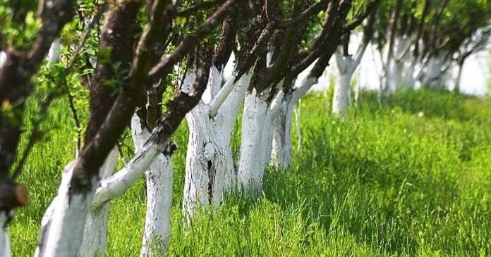 Самый простой способ – это побелка. Но ее применяют, когда деревьям больше трех лет. Молодые деревца лучше обмотать синтетическим материалом, используя капроновые колготки, синтетическую мешковину из-под сахара или крупы, лутрасил или спанбонд. (Однако лутрасил и спанбонд не защищают от грызунов.) Не следует обматывать стволы рубероидом или другим темным материалом. Весной он быстро нагревается на солнце, и камбий пробуждается днем, а ночью сильное похолодание прекращает этот процесс. Камбий от таких перепадов дневных и ночных температур может погибнуть, а это приведет к отслаиванию коры.