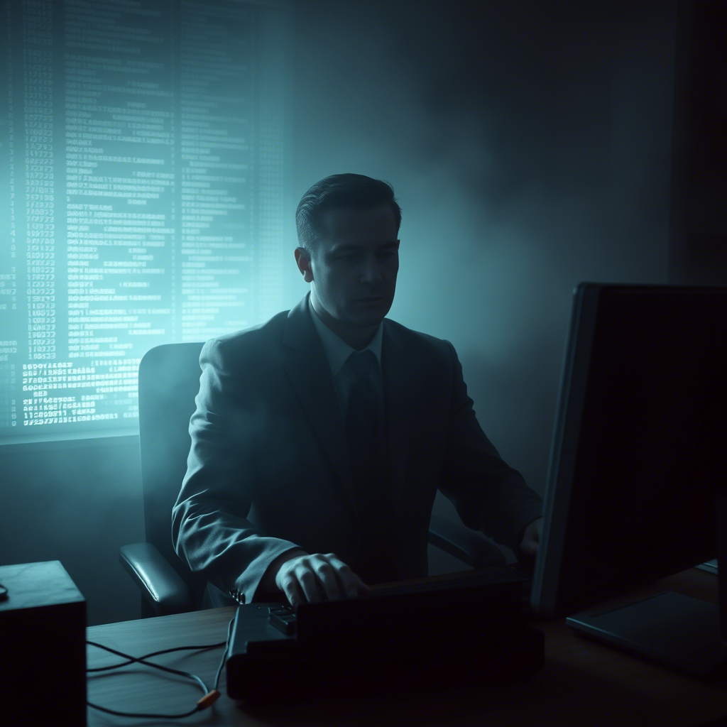 Мужчина сидел за письменным столом в углу комнаты. Монитора не было — только тень на стене, в которой пульсировали зелёные символы.