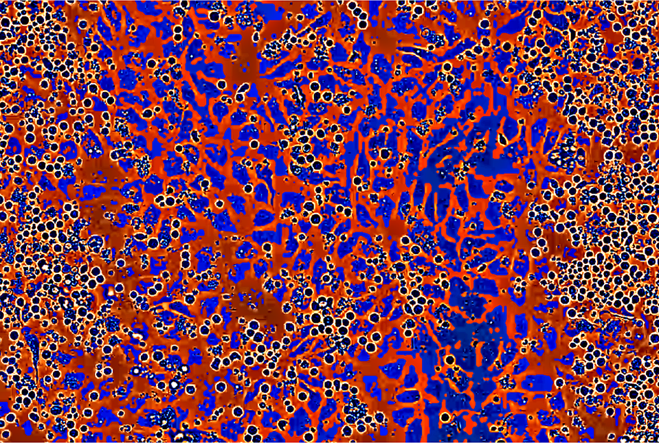 Показано, что взрослые мобилизованные гемопоэтические стволовые клетки/клетки-предшественники (HSPC), в которые была введена модифицированная Fli-1 мРНК, разрастаются поверх модифицированных эндотелиальных клеток сосудов (ECs). Изображение в оттенках серого было раскрашено в синий и красный цвета с помощью ECS (крупные, размазанные и веретенообразные) и HSPC (мелкие и округлые), а границы HSPC выделены желтым цветом. Фото: Rafii lab