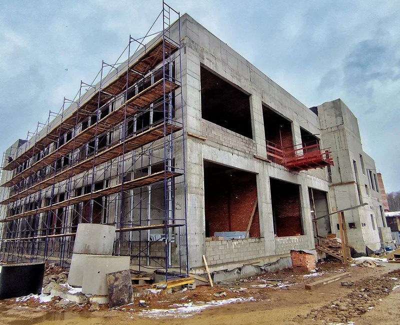 Сейчас на объекте завершается строительство кровли, кладка стен, монтируются фасады и устанавливаются рамы для стеклопакетов.