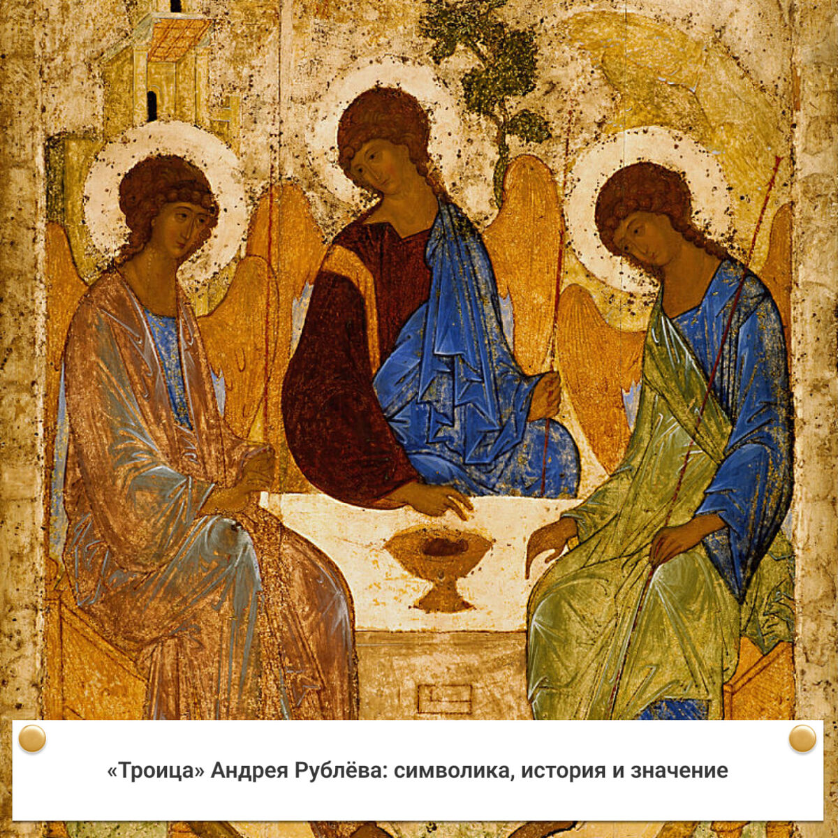 Икона «Троица» Андрея Рублёва была написана в начале XV века по заказу игумена Никона для Троице-Сергиева монастыря в память о его основателе, преподобном Сергии Радонежском. Икона призвана выразить идеал единства и любви, который проповедовал Сергий. Икона изображает трёх ангелов, сидящих за столом. Этот сюжет основан на ветхозаветном рассказе о явлении Бога Аврааму в виде трёх странников (Быт. 18:1–15). Однако в иконографии Рублёва ангелы не просто гости Авраама, а символическое изображение Святой Троицы. Круглая композиция подчёркивает гармонию и единство Троицы, а лёгкие линии, мягкие цвета и прозрачность образов создают ощущение небесного мира. Икона оказала огромное влияние на русскую иконопись и искусство в целом. Она стала эталоном православного понимания Троицы и была признана Русской Православной Церковью как каноническое изображение Святой Троицы. В 1929 году икона была перенесена в Третьяковскую галерею, а в 2023 году вновь передана Русской Церкви для хранения в храме Друз