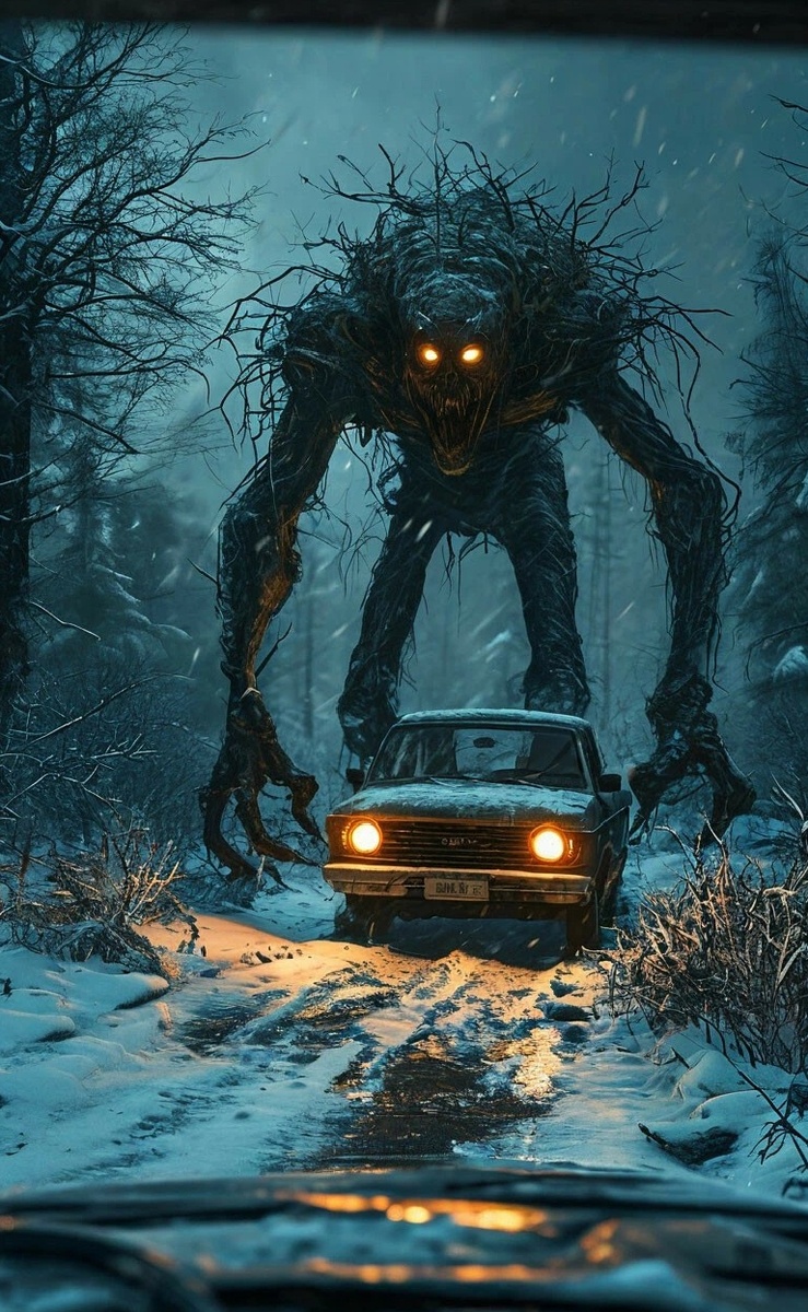 Перед ними стояло возникшее из ниоткуда чудовище высотой чуть более 6 метров. Форма его тела напоминало человеческую – отчетливо оформленное туловище, ноги с широкими стопами и непропорционально длинными руками, заканчивающимися крючковатыми пальцами с острыми когтями. Все тело чудовища было слеплено из черных жгутов, напоминающих искусно переплетенные между собой лозы. В некоторых местах они выпирали концами наружу, будто неведомому мастеру надоела его работа и он оборвал ее, так и не придумав, куда спрятать недоделки. Мощное тулово венчал такой же черный череп с горящими впадинами глаз и чуть выдвинутой вперед челюстью, которая при открытии демонстрировала три ряда острых зубов разного размера. Жуткое зрелище вызвало в рядах людей настоящую панику и после секундного замешательства они кинулись наутек, бросая на ходу дорогостоящие приборы и смешно утрамбовываясь в свои машины. Самые шустрые уже выруливали на дорогу, чем спровоцировали тератола на погоню. С душераздирающими воплями он бросился за ускользающими из поля зрения людьми, не давшими в полной мере напитаться пробудившимися страхами.