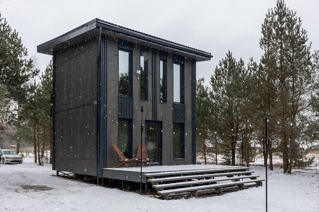 Каждый этаж вышел по 25 квадратов. На первом находится совмещенная кухня-гостиная и санузел с душем. За панорамным окном — терраса, живописный вид на участок с лесом, который занимает 100 км.
