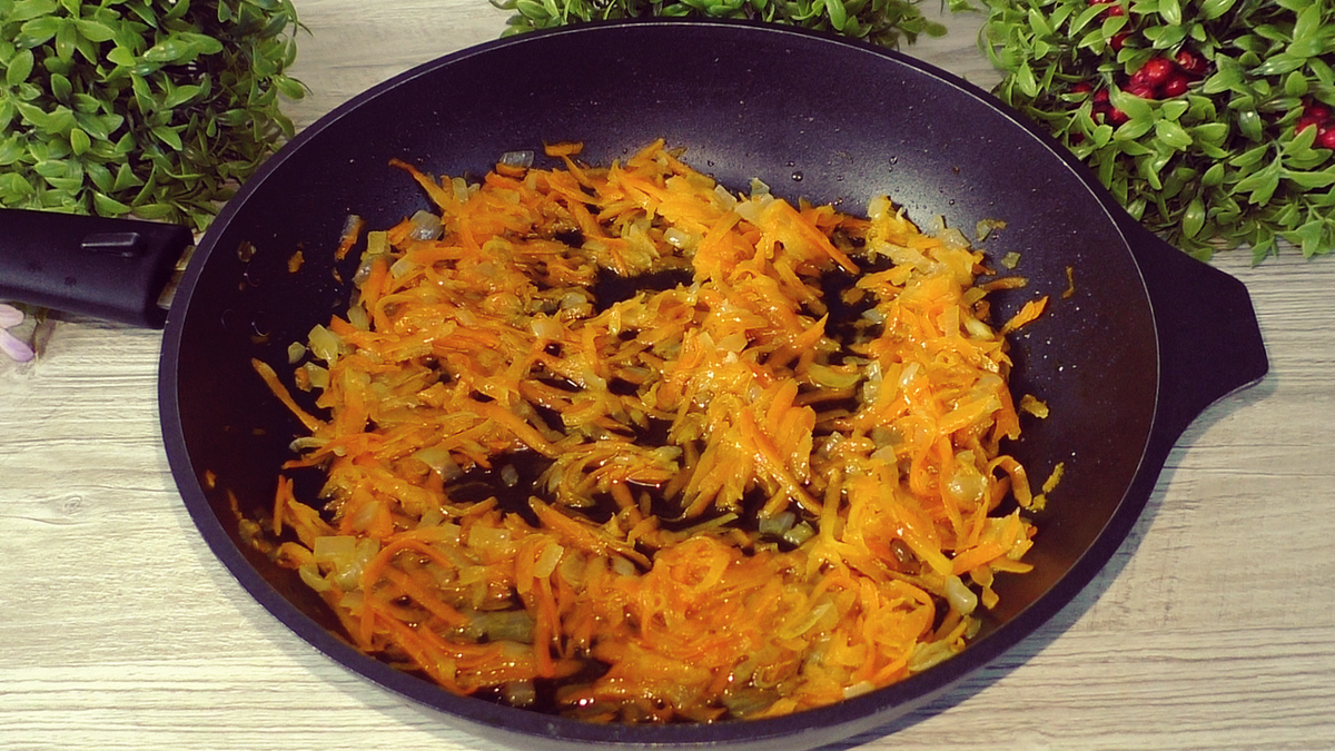 Обжарьте лук и морковь до готовности. Сначала до прозрачности обжарьте лук, а затем добавьте морковь. Добавление моркови после того, как лук слегка обжарился, позволяет ей впитать ароматы и жир, выделяемые луком, что обогащает вкус будущего блюда.