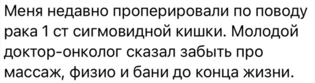 На днях получила такой вопрос от подписчицы: "Меня недавно проперировали по поводу рака 1 ст сигмовидной кишки. Молодой доктор-онколог сказал забыть про массаж, физио и бани до конца жизни." Напишу, как я думаю сейчас. 1. Баню можно точно: Когда в организме нет рака. Точно нет. Например, прошло 5-10 лет после операции, пройдены все обследования, и признаков роста опухоли нет. 2. Можно, но неточно: Прошло менее 5 лет после операции и по обследованиям опухоли нет. Обычно своим пациентам я рекомендую подождать хотя бы года два. Если все хорошо, то риск рецидива после двух лет минимальный. И можно делать практически все процедуры, какие хочется. Вот пишу это и думаю. А почему мы запрещаем онкологическим пациентам баню и другие физиопроцедуры? А может, кому-то можно? А если нельзя, то почему? Кто-нибудь действительно отмечал опухолевый рост от теплового воздействия? Или это тоже очередной миф? Что вы думаете на эту тему? Может, что-нибудь читали или смотрели? Поделитесь своим опытом в